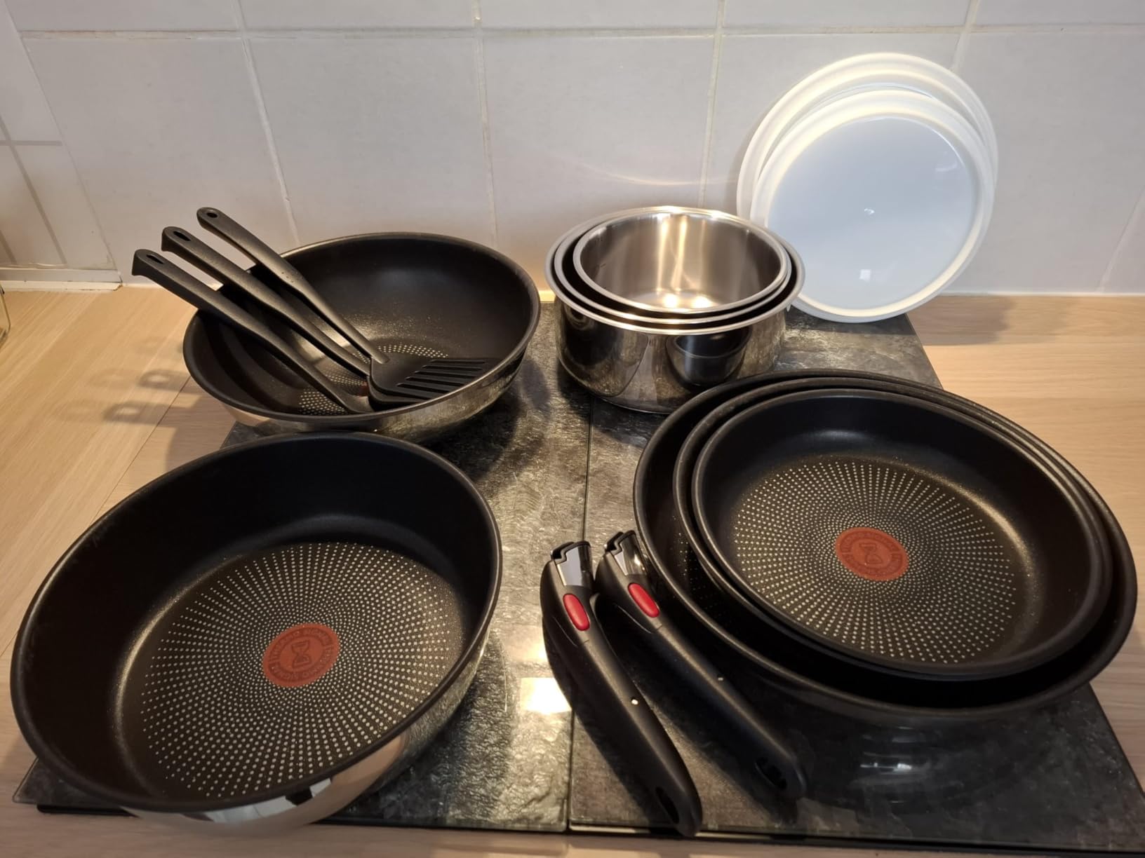 El set gigantesco de 11 piezas (¡que lo tiene todo, desde la cazuela al wok!) se apila y se guarda en un espacio minúsculo. Te abre un mundo de espacio en tus armarios. Por fin, orden y organización con un simple gesto.